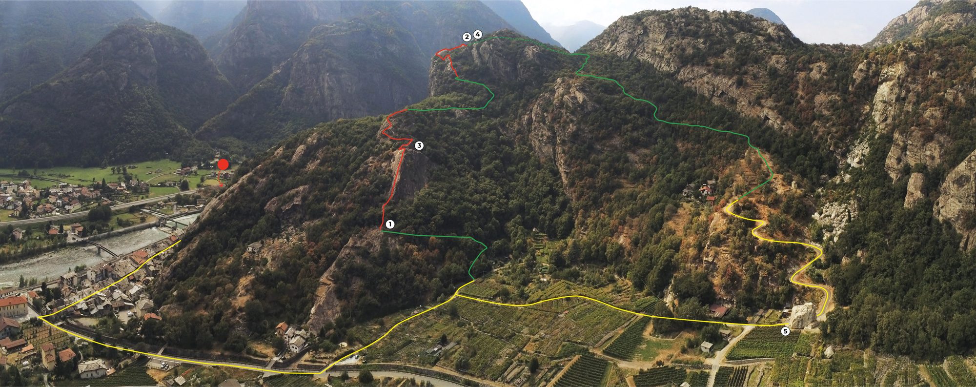 risale lungo le dorsali di roccia che si innalzano al di sopra dei terrazzi a vigneto, mano a mano che si sale la vista si apre sull’intera valle, per raggiungere una spettacolare lama di roccia a picco sulla Dora Baltea. Per i più audaci una breve variante regala un’emozione in più.